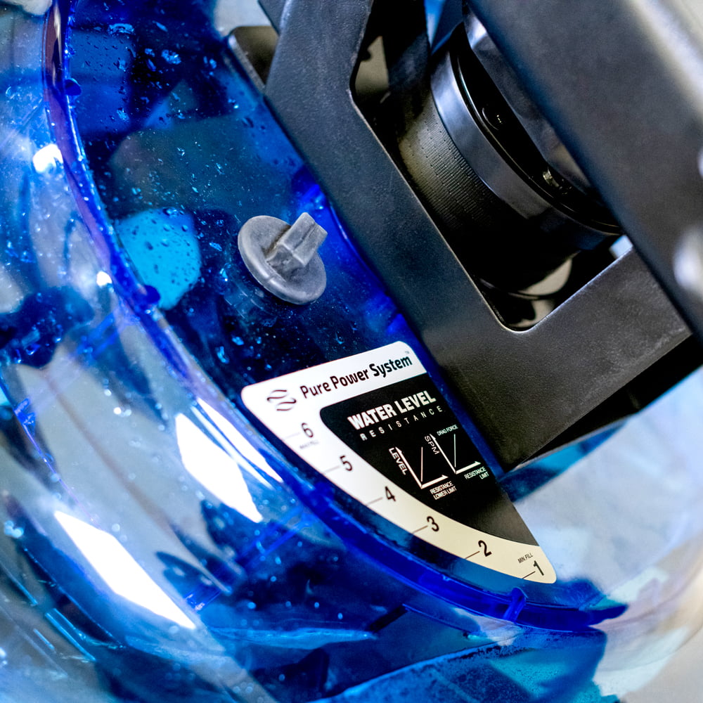 La résistance est déterminée d'une part par la quantité d'eau contenue dans le réservoir et d'autre part par la force appliquée lors de la traction de la rame. Le réservoir d'eau est fabriqué en plastique incassable et peut contenir jusqu'à 12.9 litres.